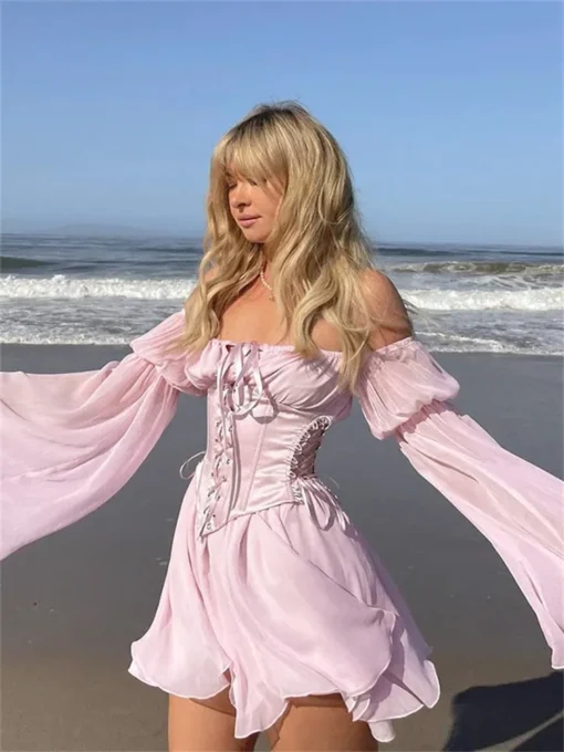 Women Vintage Dress Off Shoulder Long Sleeve Pleated Dress with Bandage Corset Summer Fall Party Evening Elegant Dresses