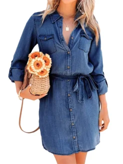 Women Autumn Denim Shirt Dress Solid Color Long Sleeve Button-Down Lapel Short Dress with Belt