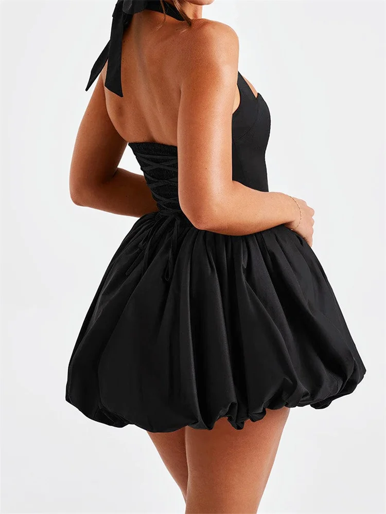 Women Sleeveless Halter Dress Summer Casual Tie up Backless Corset Bubble Party Dress for Beach Club Streetwear
