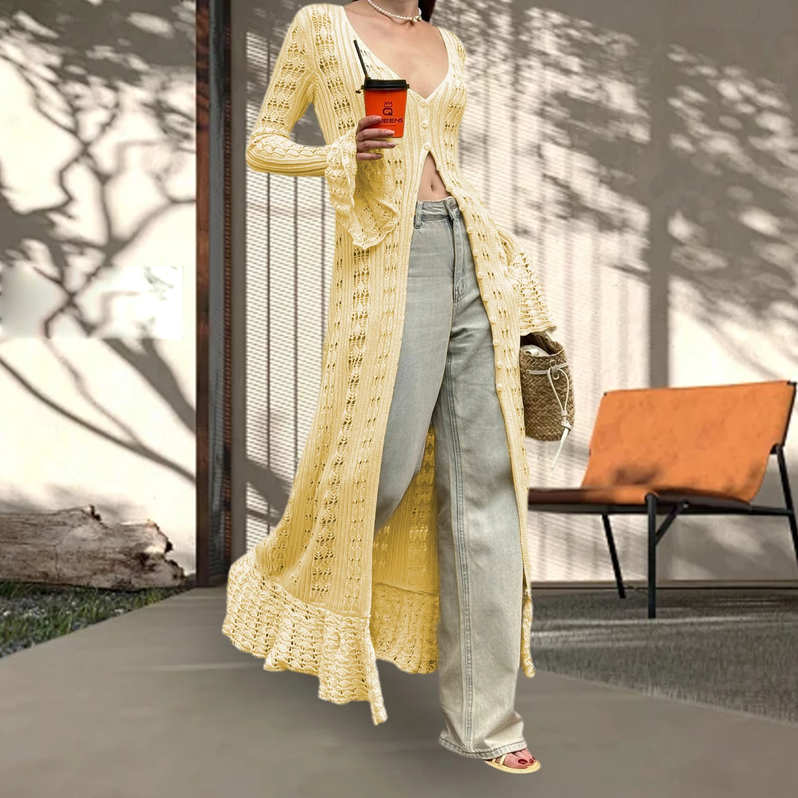 Women Knit Cardigan Long Sleeve Button Closure Hollowed Solid Fall Long Jacket for Daily Street