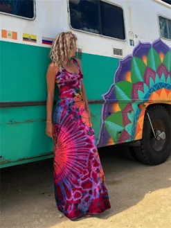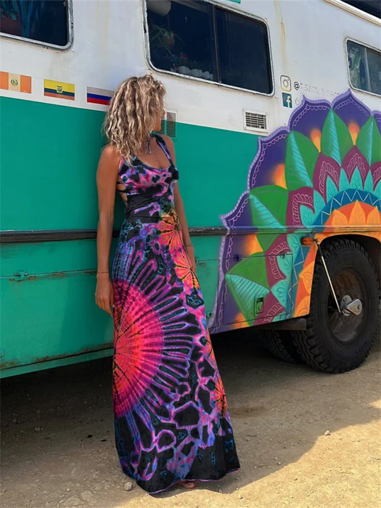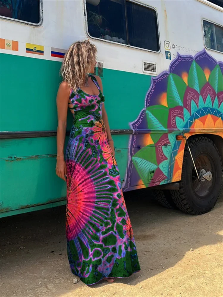 Women Summer Casual Long Dress Tie-Dye Print U-Neck Sleeveless Dress Fashion Cross Backless Dress