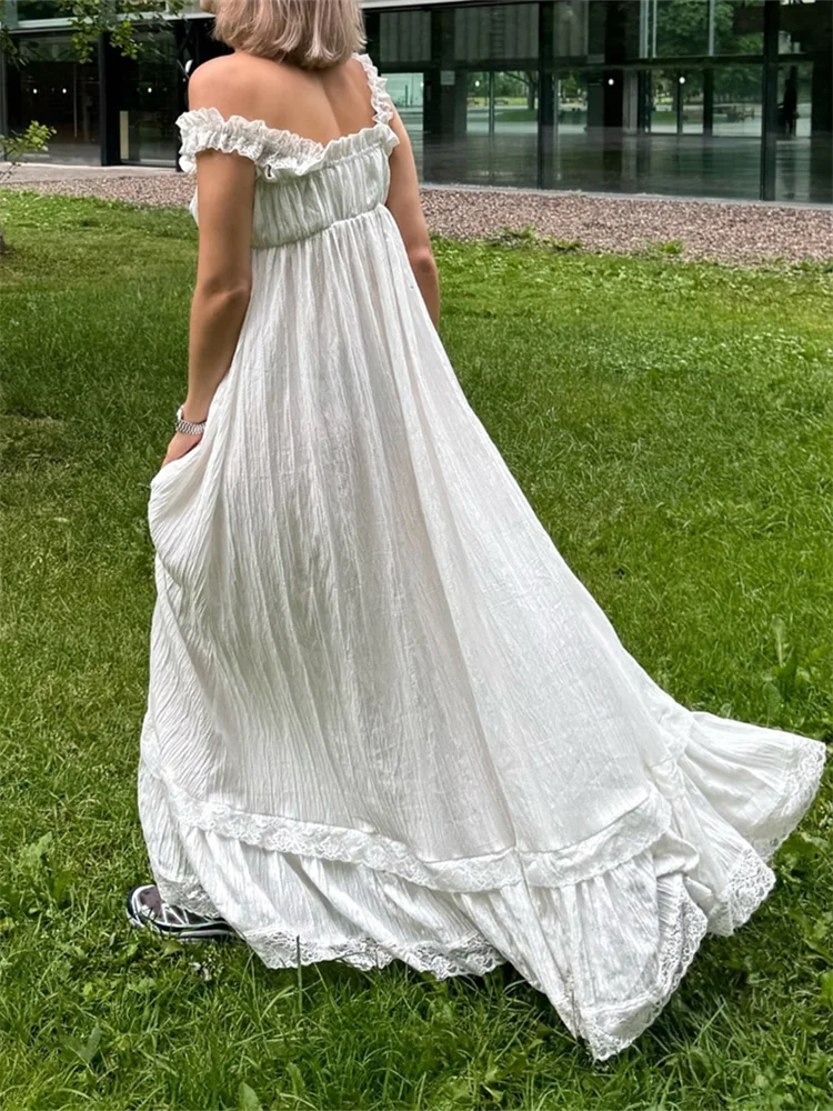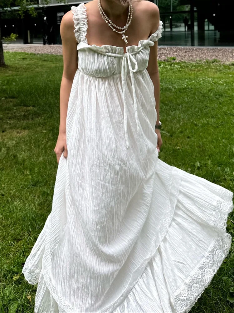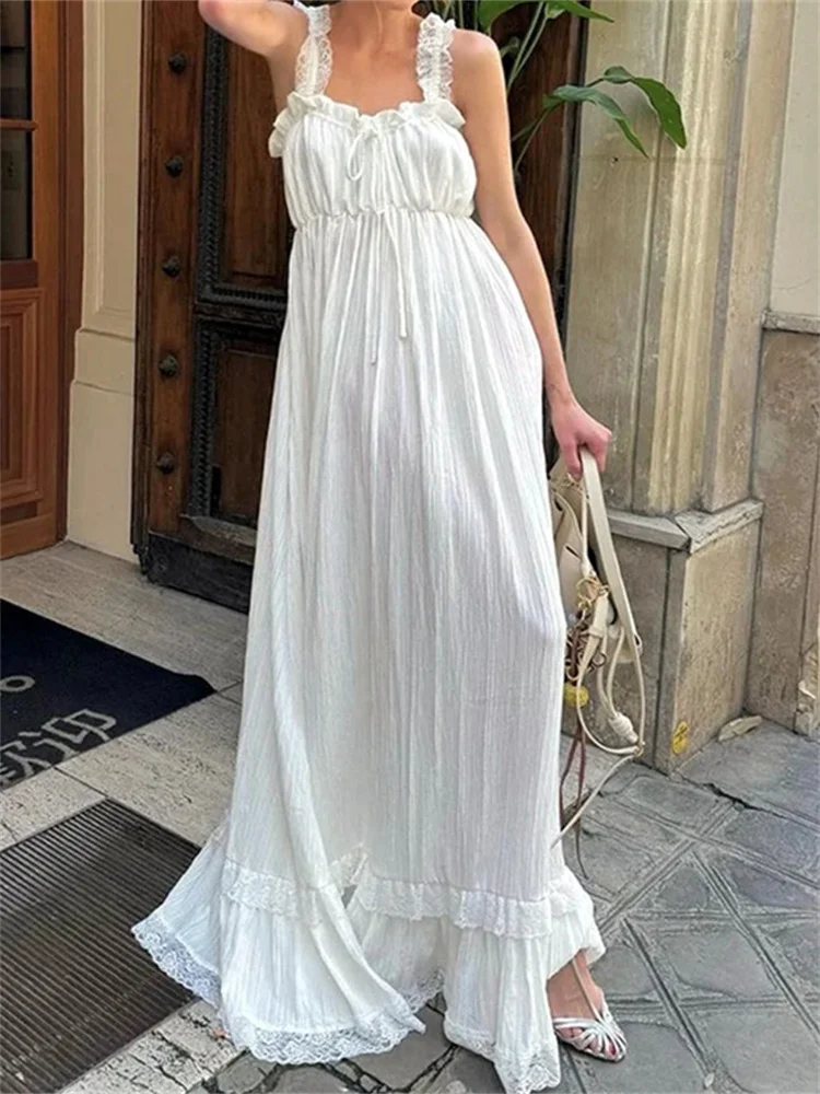 Women Long Tank Dress Lace Trim Tie-up V Neck Sleeveless Backless Empire Waist Ruffle Dress for Evening Party Club
