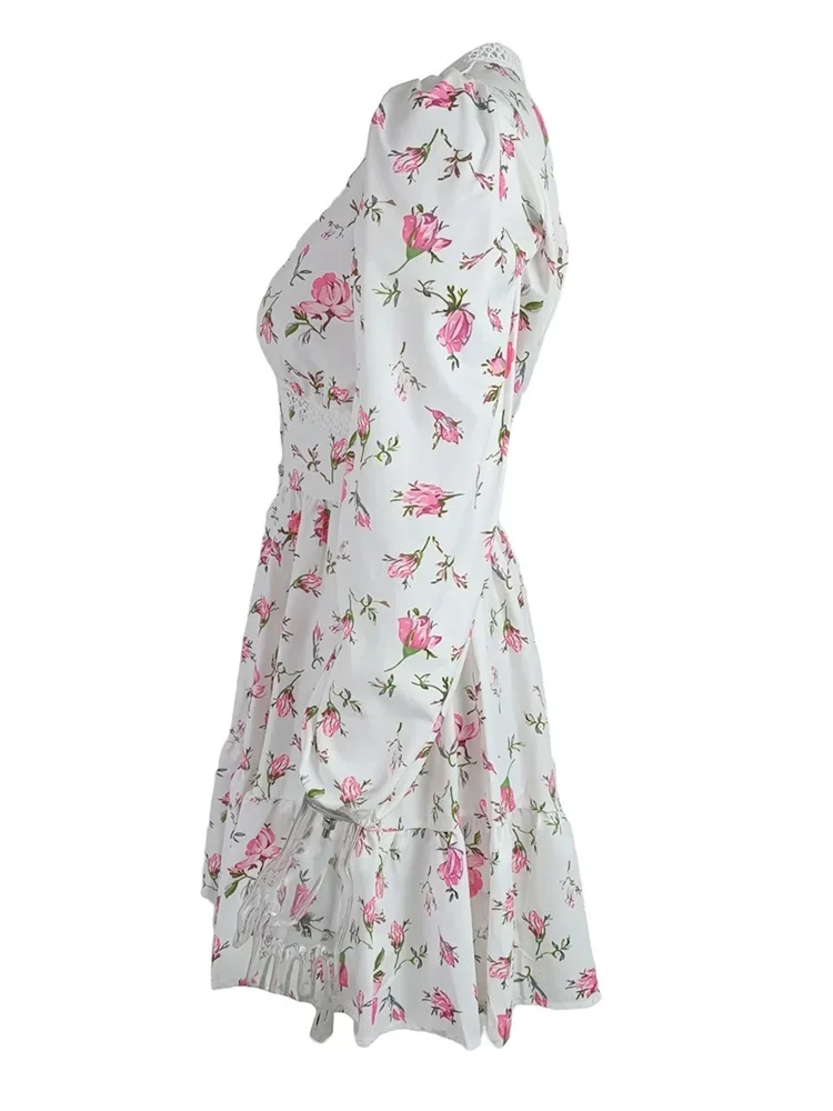 Womens Floral Print Mini Dress, Summer Long Sleeve Deep V Neck High Waist A-Line Dress