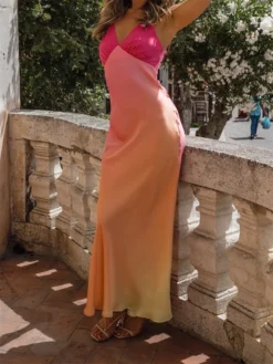 Women’s Summer Slip Dress Gradient Color Sleeveless Spaghetti Strap V-Neck Backless Slim Long Dress