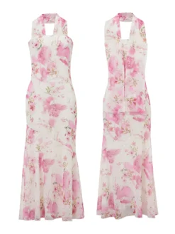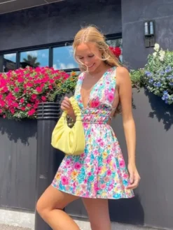 Women Summer Dress Flower Sleeveless Deep V Neck Backless Pleated Dress Bohemian Party Beach Sexy Elegant Dresses Female