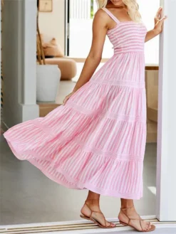Women Summer Flowy Dress Sleeveless Striped Print Long A-line Dress for Party Vacation Cocktail Beach Streetwear