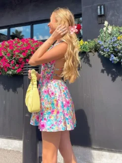 Women Sleeveless Mini Dress Summer Casual Tie up Backless Ruched Corset Dress for Party Beach Club Streetwear